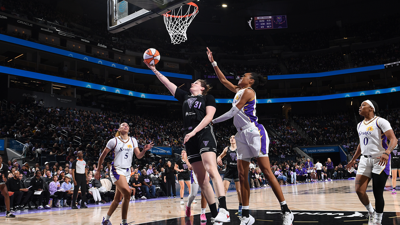 Guard Julie Vanloo had Chase Center roaring with three straight highlight-reel threes in the third quarter. Vanloo's first three was a spot-up triple from just in front of the Chase logo. On the next possession down, she walked into a pull-up three from the top of the key and passionately yelled, waving her hands to egg the crowd on. For her heat check, she utilized a jab step, giving her just enough airspace to rise and splash over Sparks guard Kelsey Plum's outstretched fingertips.
